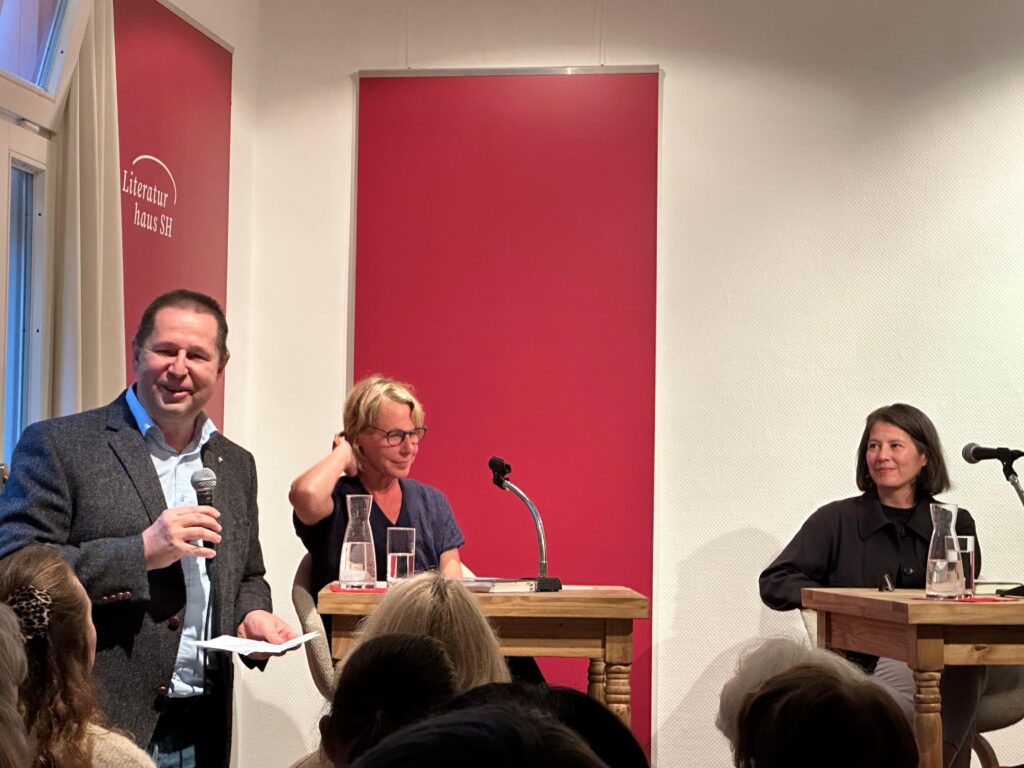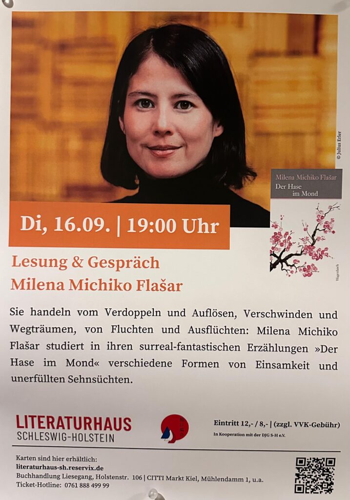 Am 16.09.2025 fand im Literaturhaus Schleswig-Holstein eine Lesung der österreichisch-japanischen Schriftstellerin Milena Michiko Flašar statt. Vor etwa 60 Zuhörerinnen und Zuhörern (darunter acht DJG-Mitgliedern) trug die Autorin aus ihrem neusten Erzählband „Der Hase im Mond“ vor. Dr. Jens Neumann-Rodekirch, Vorsitzender der DJG-SH, begrüßte die Autorin. Die DJG-SH kooperierte mit dem Literaturhaus, weil die Erzählungen von Frau Flašar regelmäßig in Japan spielen. Bekannt geworden ist die Autorin durch ihre Romane „Ich nannte ihn Krawatte“ und „Oben Erde, unten Himmel“.