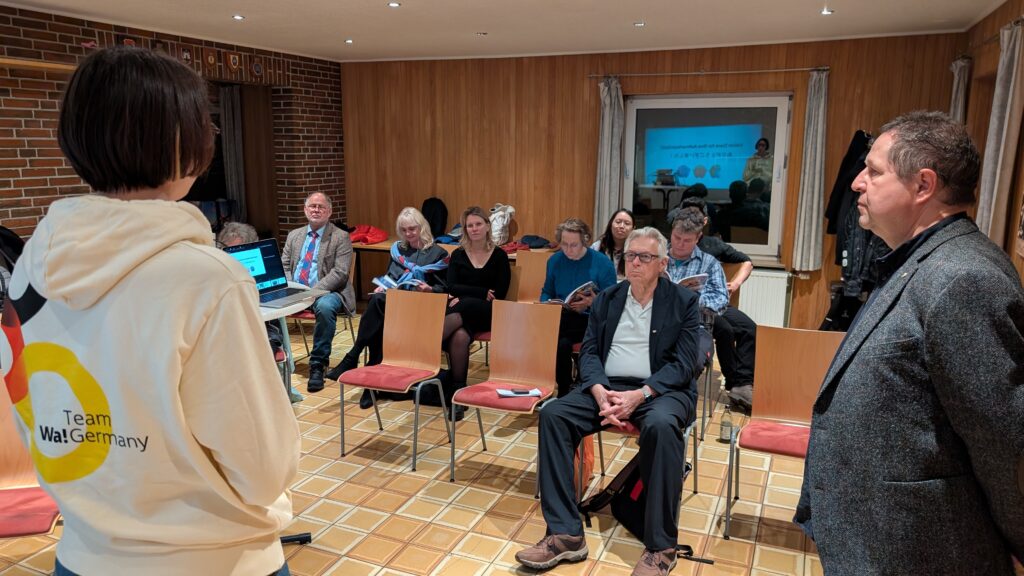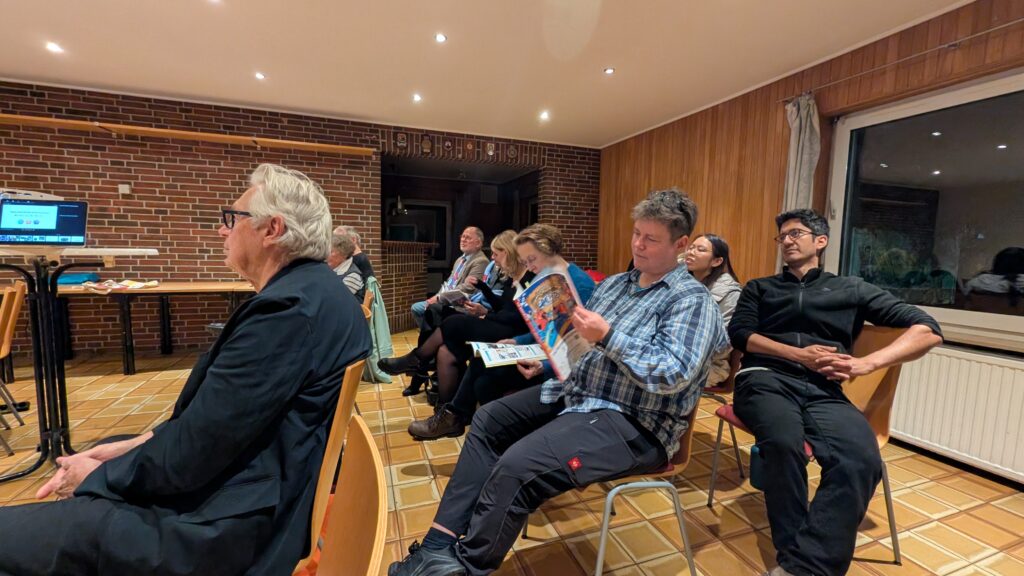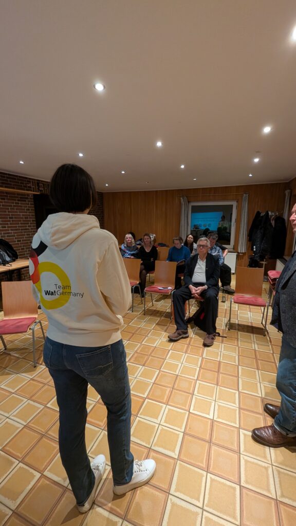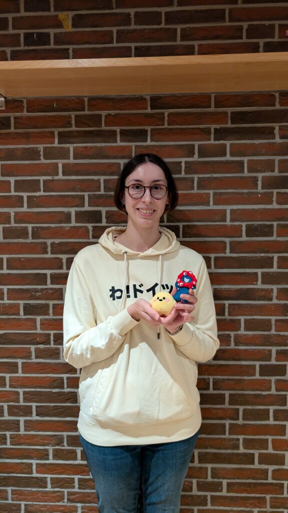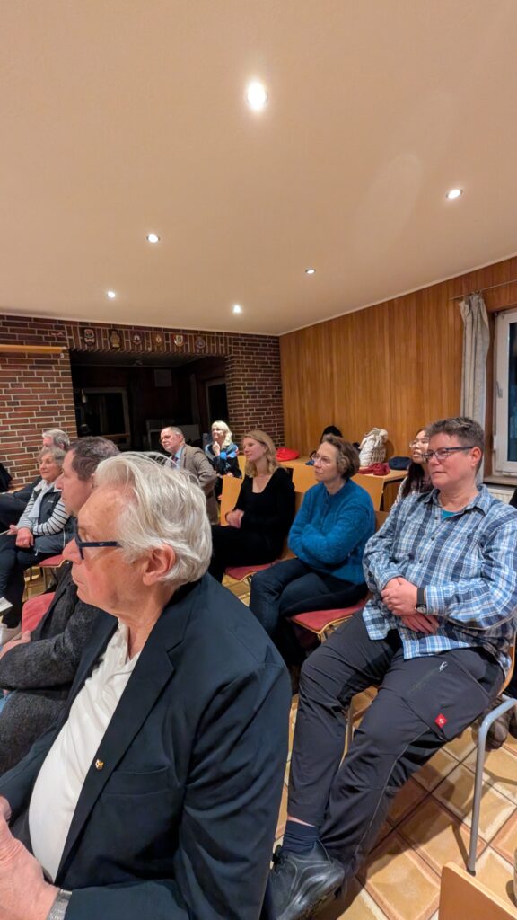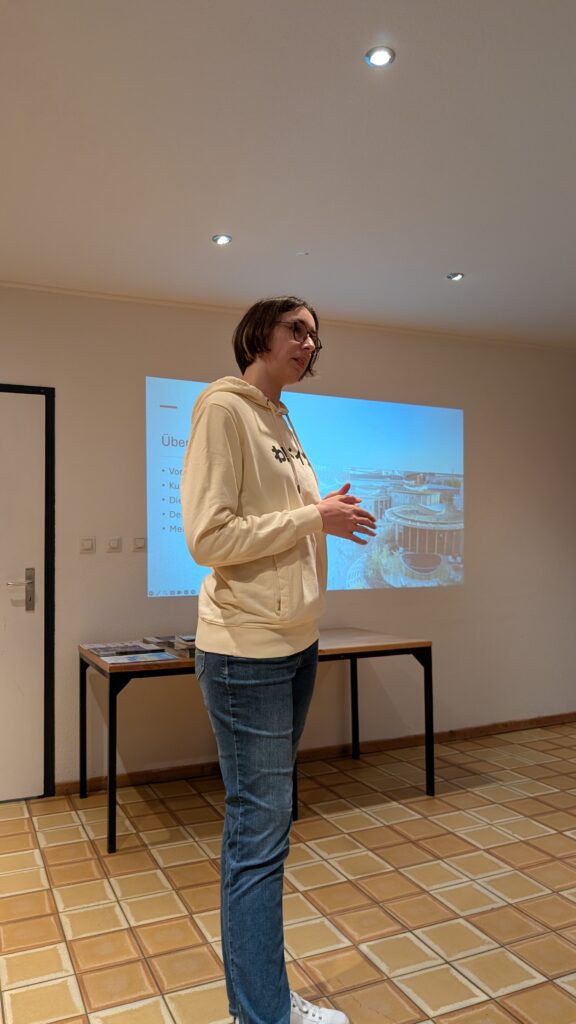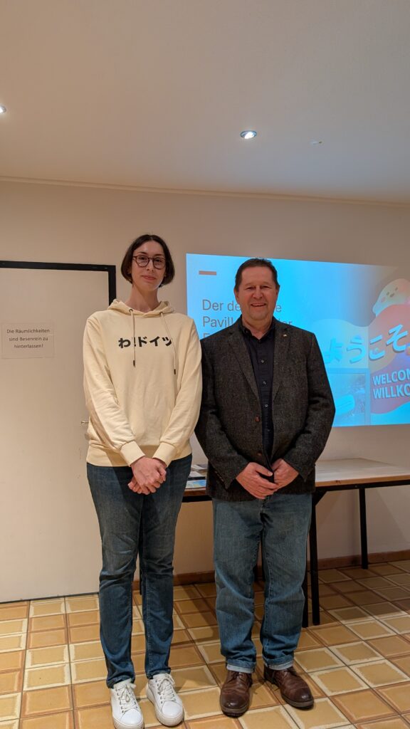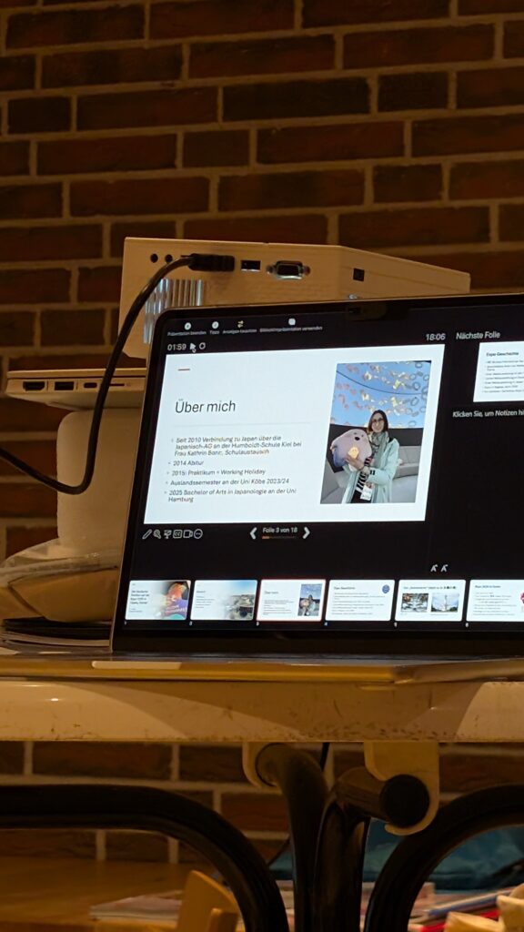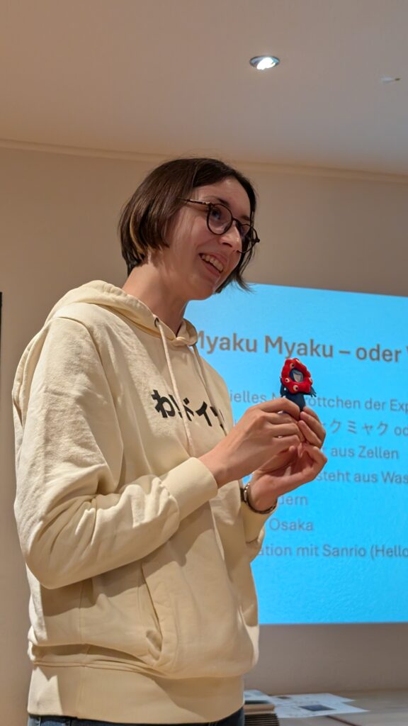 Die 29-Jährige erzählte in ihrem lebendigen Vortrag von ihrer Arbeit auf der EXPO in Osaka, Japan. Die Zuhörer horchten gespannt auf die Erzählungen der jungen Japanologin – von Abläufen auf der Messe über Maskottchen bis zu anspruchsvollen, internationalen Gästen war ihr Vortrag überaus interessant und zog die anwesenden DJG-SH-Mitglieder in ihren Bann. Ein paar ihrer gesammelten Materialien hatte sie ebenfalls mitgebracht: darunter das Maskottchen der EXPO 2025 „Myaku-Myaku“, Magazine zur und von der EXPO sowie eine Nachbildung des deutschen Maskottchens „Circular“.