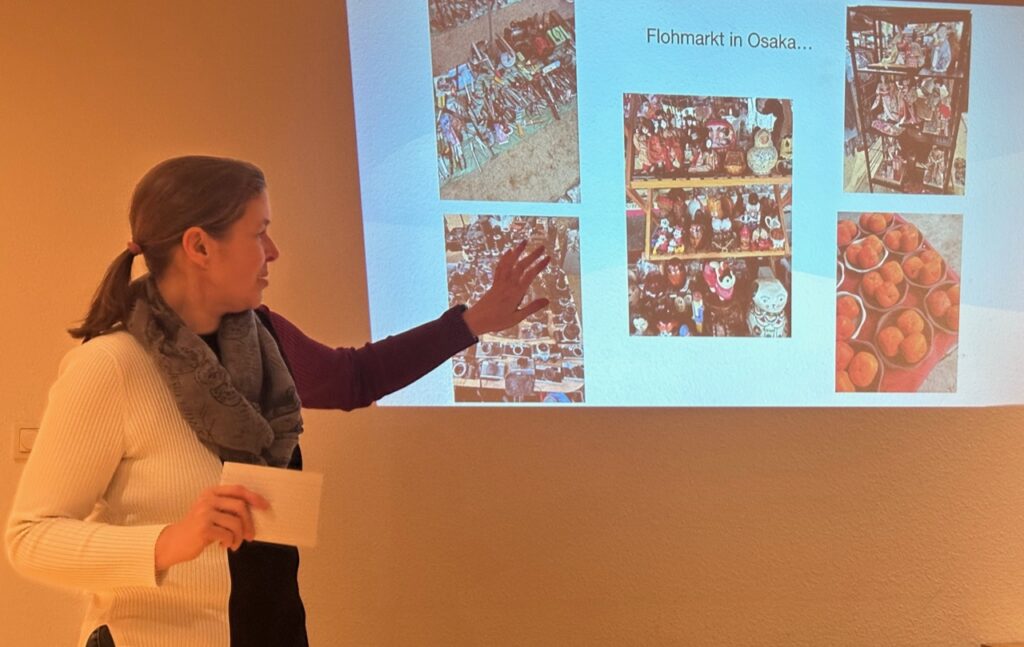 Zum Hintergrund ihrer Japan-Affinität erzählte Kerstin Gerber vor neun sehr interessierten Gästen, dass sie bereits mit 14 Jahren eine Brieffreundschaft mit einem japanischen Mädchen begonnen habe und dass sie 2018 anlässlich des 30jährigen Bestehens dieses Kontaktes ihre erste Japanreise gemacht und dabei ihre Brieffreundin getroffen habe.