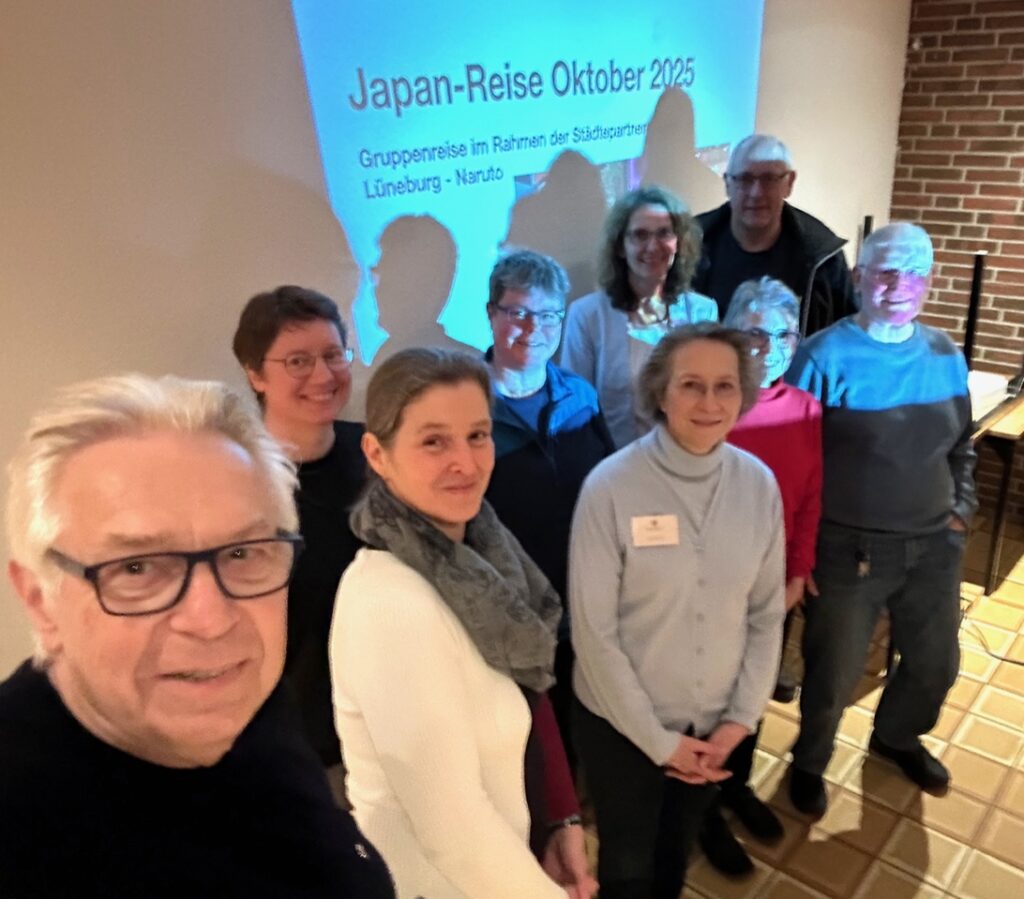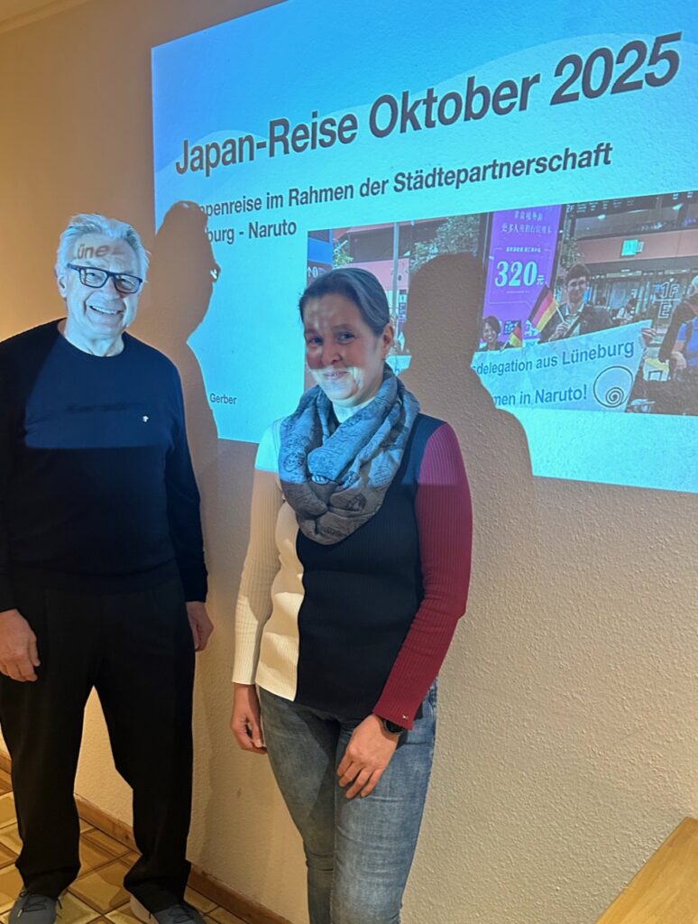 Am 10.03.2026 berichtete unser DJG-Mitglied Kerstin Gerber auf dem Stammtisch im FT Adler-Heim über ihre Japan-Reise im Herbst 2025. Sie hatte diese Tour mit der DJG Lüneburg, bei der sie seit 2018 ebenfalls Mitglied ist, unternommen. Seit 1974 gibt es eine Städtepartnerschaft zwischen Lüneburg und der Stadt Naruto auf der Insel Shikoku, in die später auch die korrespondierenden deutschen und japanischen Gesellschaften eingetreten sind. Seit langem gibt es auch regelmäßige Gruppenreisen zwischen Lüneburg und Naruto.