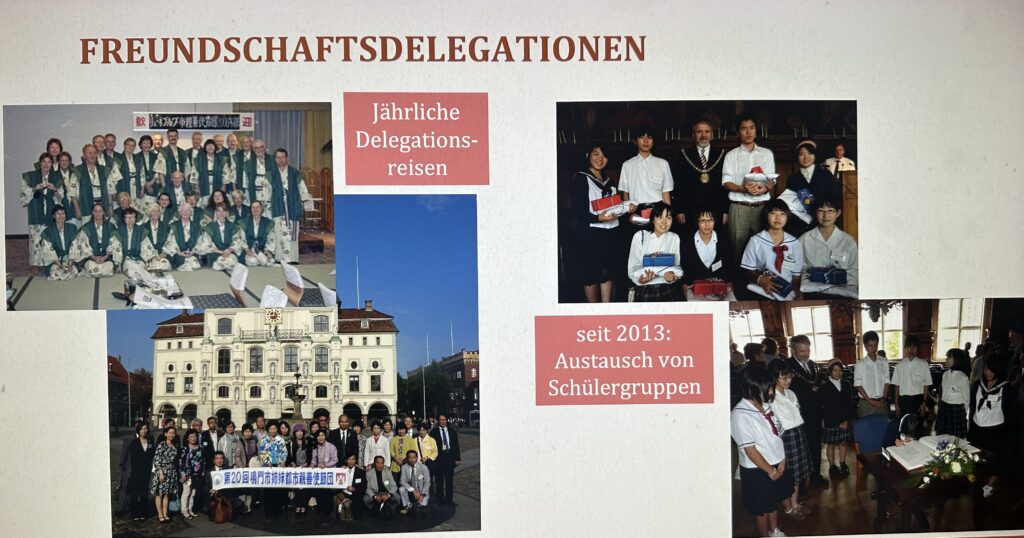 Im weiteren berichtete unser Lüneburger Gast vom Ablauf der Delegationsreisen: Zu Beginn kommt der offizielle Teil mit Begrüßung, Reden, gemeinsamen Essen und einem Tag Aufenthalt in einer Familie sowie Ausflügen in Naruto und Umgebung (ca. 3-4 Tage), danach dann eine organisierte Busreise durch verschiedene japanische Regionen (ca. 10 Tage, insgesamt ca. 14 Tage). Mittlerweile hat die deutsche Seite auf diese Weise einen großen Teil Japans besichtigt. Volker Geball hob hervor, dass das Klima auf diesen Reisen immer sehr locker sei (auch im offiziellen Teil mit Tänzen und Singen). Des weiteren erwähnte er, dass es in Naruto mittlerweile auch eine „deutsche Kultur“ gäbe, z.B. das Deutsche Haus mit einem Museum zu Bandō und der Geschichte der Städtepartnerschaft, einen Lüneburger Platz mit einer Lüneburger „Salzsau“, einen Bäcker mit deutschem Brot oder eine deutsche Bar mit dem Namen „g’suffa Prost!“ Auch der Gedenkstein für die deutschen Gefangenen wird regelmäßig besucht und die Pflege durch eine Spende der Lüneburger Delegation unterstützt.
